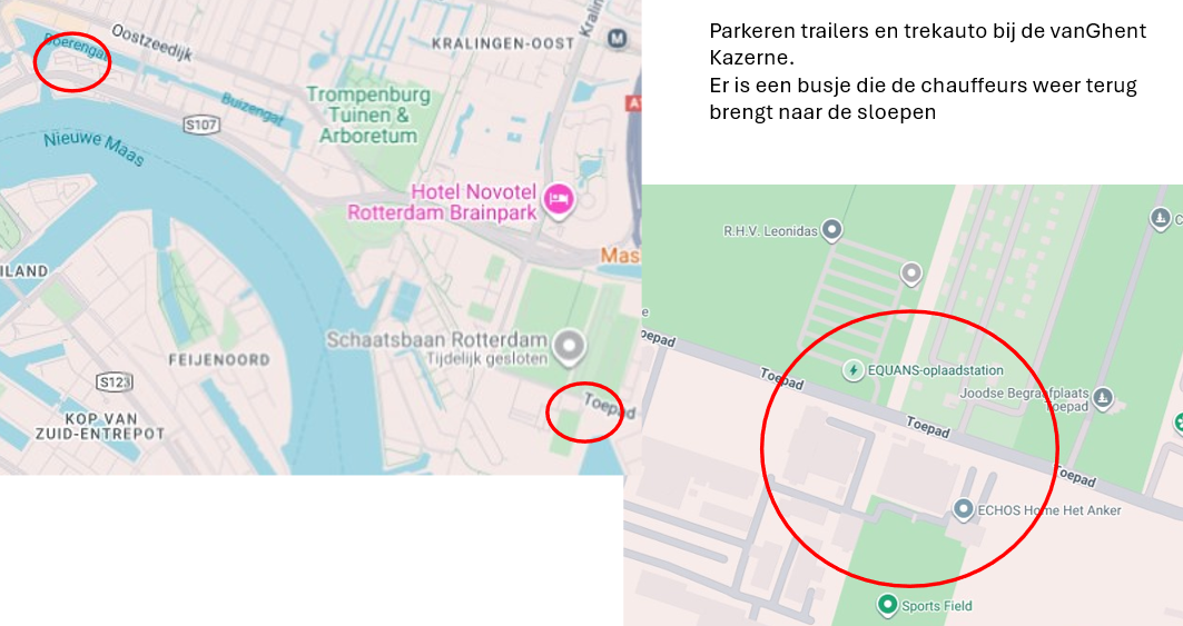 De trailers en hun trekauto kunnen gratis parkeren naast de Van Ghent Kazerne. De chauffeurs worden weer opgehaald door een busje.